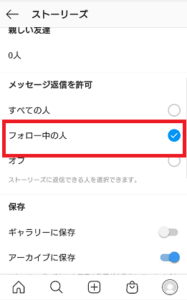 クイックリアクションを条件なく受け付けるのではなく、フォロワーのみに限りたい場合は、「メッセージ送信を許可」の項目にあるフォロー中の人をタップし有効状態にすればOKです。