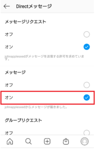 通知を受け取りたいときは右のように、最後に「メッセージ」の項目にあるオンをタップしチェックがつけばOKです。