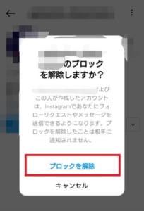 ブロックを解除したいアカウントの右にあるブロックを解除を選択し、さらにブロックを解除をタップすればOKです。