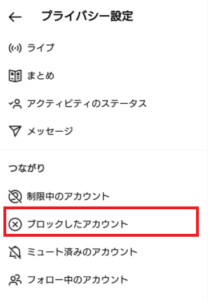 プライバシー設定を選択してブロックしたアカウントをタップします。
