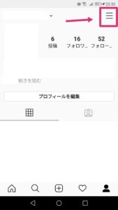 先ほどと同じようにインスタの右上にある「横棒三本線」をタップ。