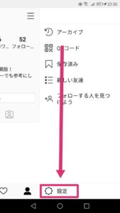 インスタを開き、右上にある「横棒三本線」をタップすると、メニューが表示されるので「設定」をタップ。