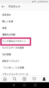 設定メニューから「アカウント」をタップした後、「リンク済みのアカウント」をタップ。