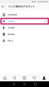 リンク済みのアカウントから「Twitter」を選びタップ。