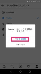 リンク済みのアカウントから「Twitter」をタップすると、「Twitterとのリンクを解除しますか?」と聞かれるので、「リンクを解除」をタップしましょう。