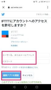すると、Twitterのページに移動するので、連携させたいTwitterの「メールアドレス」や「パスワード」を入力して「連携アプリを認証」をタップします。