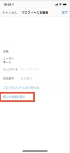 まず自分のアカウントのホーム画面のプロフィールを編集をタップしましょう。次に個人の情報の設定をタップしましょう。