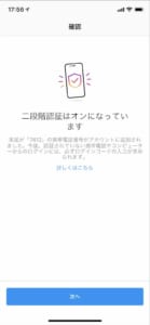 SMSをONにすると、ご自身のSMSに認証コードが届きますので確認しましょう。確認したらコードを入力しましょう。二段階認証はオンになっていますと表示されましたら、二段階認証の設定完了です。