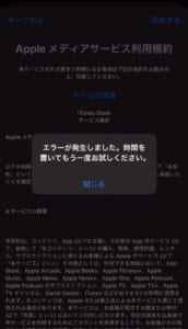 こちらはApple メディアサービス利用規約で表示されるエラーで、iOSのアップデートを多くのユーザーが同じタイミングに行なっていることが原因のサーバーエラーの可能性があります。