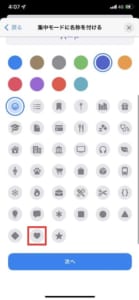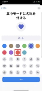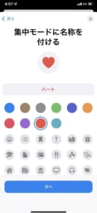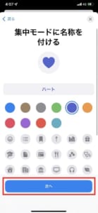 名前と色が決定したら次へをタップして、画面の指示にしたがって集中モードを設定を行ってください。