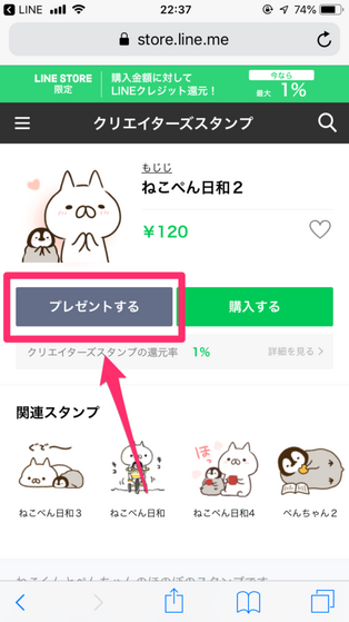 LINEスタンプをプレゼントするには、LINE Sotre経由でスタンプを購入する必要があります。