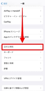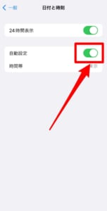 自動設定の右横にある白いボタンを押して、自動設定をオフにします。その後、時間帯の欄の下にある日付と時刻をタップ。