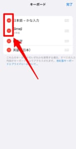 画面上に並ぶ「日本語-かな入力」と「英語(日本語)」が純正キーボードですので、そのどちらかの横にある赤丸のマイナスボタンをタップしましょう。すると削除のボタンが出てくるので、そちらをタップします。