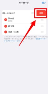 削除後、画面右上にある完了を押す事でキーボードの機能がオフになります。その後、「新しい絵文字の出し方」で解説した方法で削除したキーボードを新たに追加すれば、キーボードの再設定が完了です。