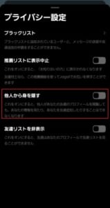 他人から身を隠すにチェックを入れれば、友だち以外からプロフィールの詳細確認や友だち追加ができなくなります。