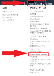 Amazonトップページ上部にある「アカウント&リスト」にログインした状態でカーソルを合わせ、「お客様のKindle Unlimited」をクリックします。