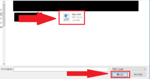 ファイルが表示されるので、追加したいPDFデータを選択して「開く」をクリックします。