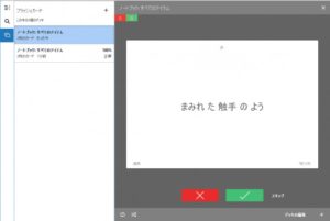 先ほどは解説をあえてしませんでしたが、作成したフラッシュカードを開くと、このように成否を選択するボタンが緑と赤で表示されるので、ここで正解か不正解かを選択していきます。