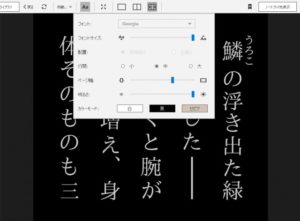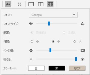 フォントサイズを大きくして、画面のカラーを黒、ページ幅や画面の明るさも設定出来ます。