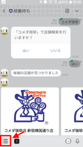 トーク画面を開き、左下をクリックして「コメダ珈琲」と入力すると上の右画像のように店舗が検索され表示されます。