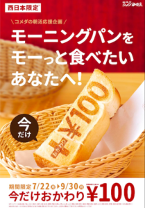 例えば2019年夏では、西日本地区のコメダ珈琲に限り「モーニングパンおかわり¥100キャンペーン」を開催しています。