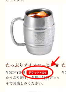 メニュー表に左側のようなチケットマークが付いているものはプラス料金なく、コーヒーチケット利用ができます。