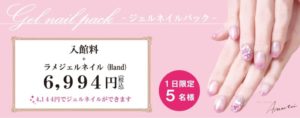 1日5名までのパックプラン。すでに施術済みの場合はジェルネイルオフ費用(1,620円)がかかります。