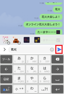 花火エフェクトを表示させるには、LINEのトーク画面を開いて「たまや」「かぎや」「花火」などを含む文章を入力して送信アイコンをタップすればOKです。
