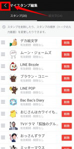 マイスタンプ編集をタップすると、今までにダウンロードしたスタンプが表示されるので、普段使うものの右横にある削除をタップしてください。