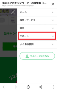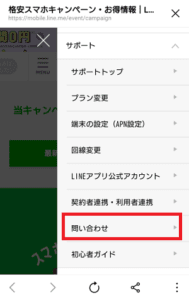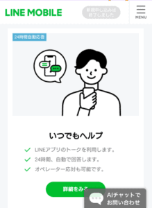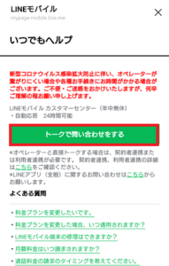 LINEモバイル公式アカウントを友達登録(【いつでもヘルプ(サービスページから問い合わせ)】参照)し、サービスページからLINEモバイルのページにアクセスしたら、MENUからサポートを選択してください。
