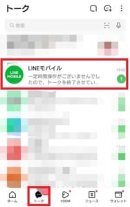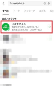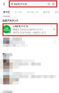 LINEモバイル公式アカウントの登録方法は、トークタブで検索窓を選択し、「LINEモバイル」と検索にかけて表示されたLINEモバイルをタップします。