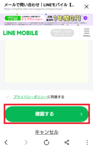 問い合わせたい詳細について記入したら確認するをタップすることで問い合わせが可能です。