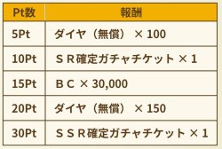 pt数と報酬については、上の画像の通りです。30pt貯めれば、SSR確定ガチャチケットがもらえます。
