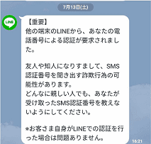 LINE運営のシステム・セキュリティ用のアカウントから「他の端末のLINEから、あなたの電話番号による認証が要求されました」というメッセージが届くことがあります。