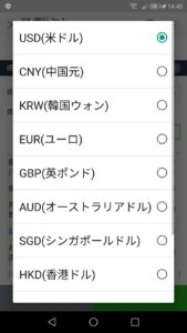 まず、左側画面の両替通貨をタップして両替したい通貨を選びます。