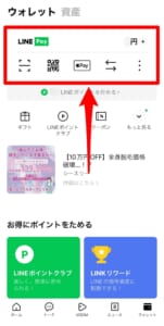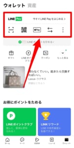 LINEのトップページ右下のウォレットをタップします。次に画面上にあるLINEpayの項目内のボタンのどれかをタップします。