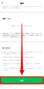 解約をするにはまず、LINEpayのメニュー画面きましょう。開き方は「LINEpayが不正利用を確認する方法」で解説した通りです。その後、画面右上の設定ボタンをタップします。設定画面を下へスクロールし、解約をタップします。