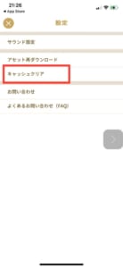 まずタイトル画面で、設定マークをタップしましょう。次にキャッシュクリアをタップしましょう。