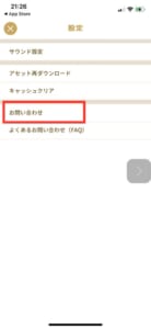 まずタイトル画面で、設定マークをタップしましょう。次に、お問い合わせをタップします。