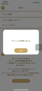 「キャッシュクリアするとストレージの空き容量が増えます。この作業でアイテムなど消えることはありません。キャッシュクリアで、不具合や表示エラーが解消されることがあります。キャッシュクリアによりアイテムやショップを表示する際に、画像の読み込みが遅くなる場合があります。」と表示されるので、キャッシュクリアをタップしましょう。