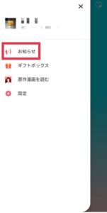 アプリの左上にある三をタップした後、メニューからお知らせをタップしてください。