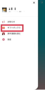 アプリのトップ画面左上にある三をタップ後、メニューからギフトボックスをタップしてください。