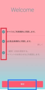 次に、利用規約への同意として✔を入れていき、確認をタップします。次に、位置情報許可の画面が表示されるので常に許可をタップしてください。