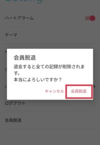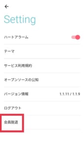 設定メニューから退会も簡単に行えます。まず、設定メニューの一番下にある会員脱退をタップしてください。