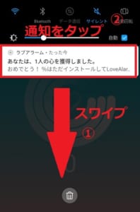 招待した友達がアプリをインストールして登録を行うと、通知が届くので、スマホの上部をタップしつつ下にスワイプします。