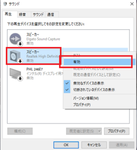パソコンでは通常であれば上の画像のようにイヤホンなどのデバイスを認識して有効の設定に自動的になるのですが、何らかの設定でデバイスを無効にしてしまった可能性があります。