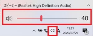 音量についてはパソコンの右下に表示されているスピーカーマークをクリックすることで、音量調整が可能です。