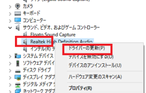 デバイスマネージャーが開いたら、「サウンド、ビデオ、およびゲームコントローラー」のイヤホンが繋がれているデバイス名の上で右クリックをしてドライバー更新をクリックしましょう。