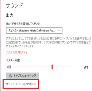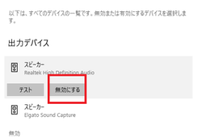 必要のない出力を無効にする場合、同じ設定ページのサウンドデバイスを管理するをクリックします。次に出力されているデバイスをクリックして無効にするをクリックすれば必要のないデバイスを隠すことが可能です。