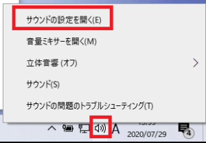 この場合、少しパソコンの設定操作を行わなければいけません。まずパソコン右下にあるスピーカーマーク⇒サウンドの順番でクリックします。